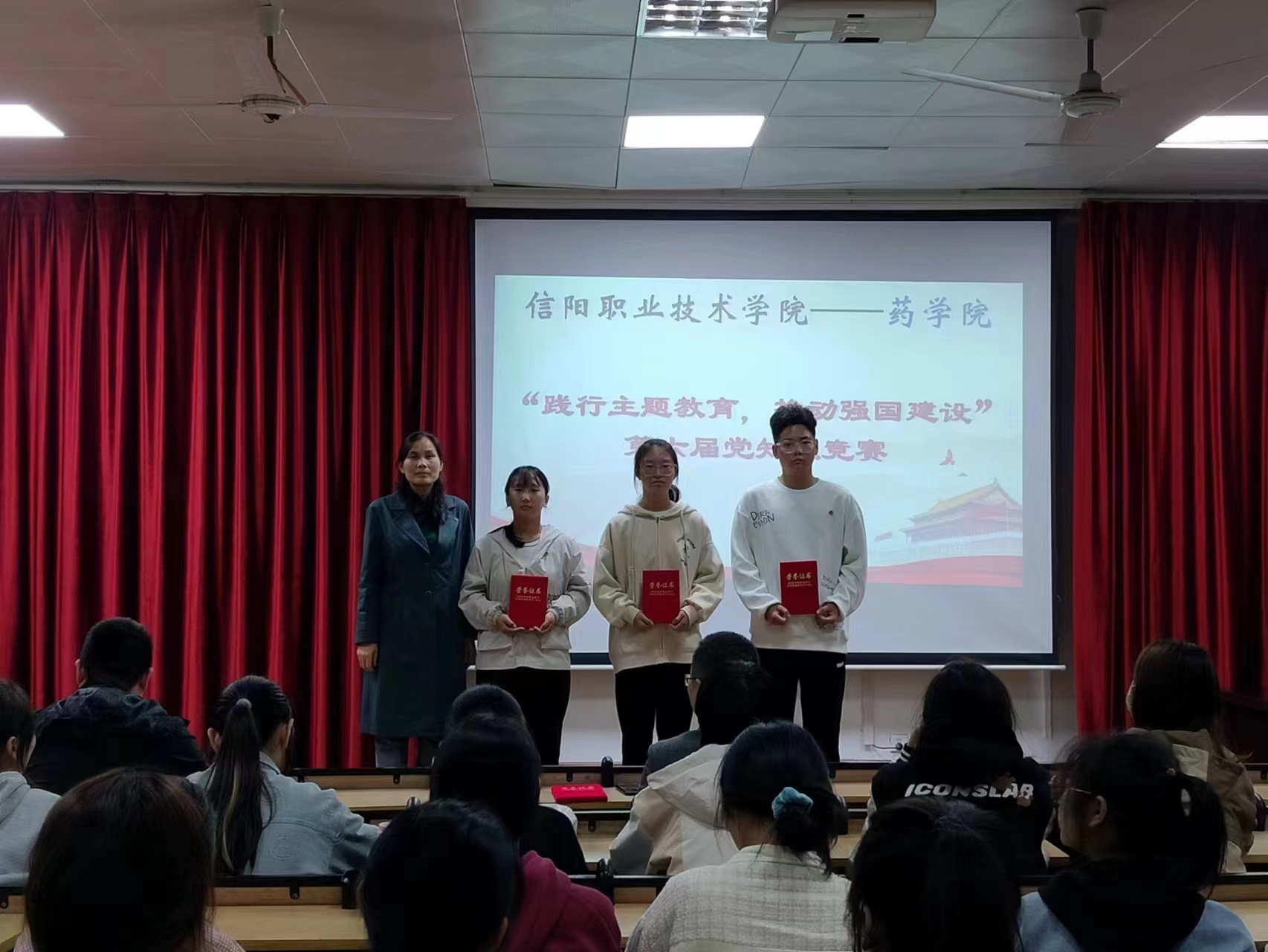 本次竞赛共分为四个环节,包括必答题、抢答题、风险题和重温经典人物题,竞赛知识涉及“习近平新时代中国特色社会主义思想”、“党的二十大知识”、“经典人物”、以及“百年党建”等内容。竞赛实行积分制,各队按照比赛各环节累计得分,竞赛现场气氛活跃,参赛人员精神饱满,经过激烈角逐,最终23级药学5班代表队获得一等奖,其它代表队分别获得二等奖和三等奖。