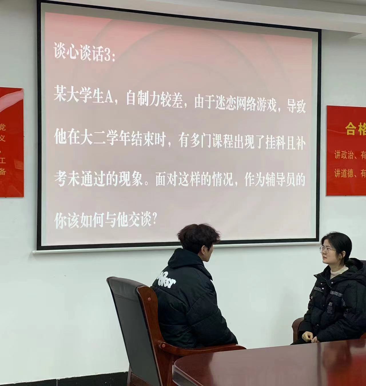 谈心谈话环节主要考察辅导员对员工特征、员工成长规律的了解把握程度及对员工的教育引领能力、解决理论困惑和实际问题的能力,此次谈心谈话环节结合辅导员的日常工作内容,从员工思想理论教育和价值引领、老员工心理健康教育、职业规划与就业创业指导等方面还原现实谈话场景。