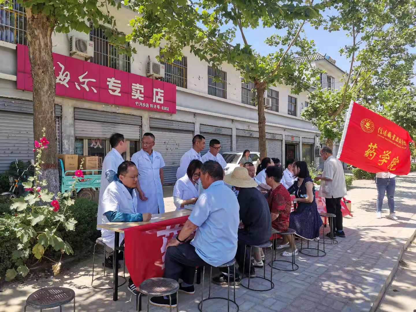 结束参观学习后,大家来到竹沟镇河西社区开展志愿服务。党员同志为前来问询的社区居民,测血压、号脉搏、细问诊,耐心解答问题,指导规范用药,同时给他们发放一些消暑防病的健康小礼品,提高预防疾病的健康理念。