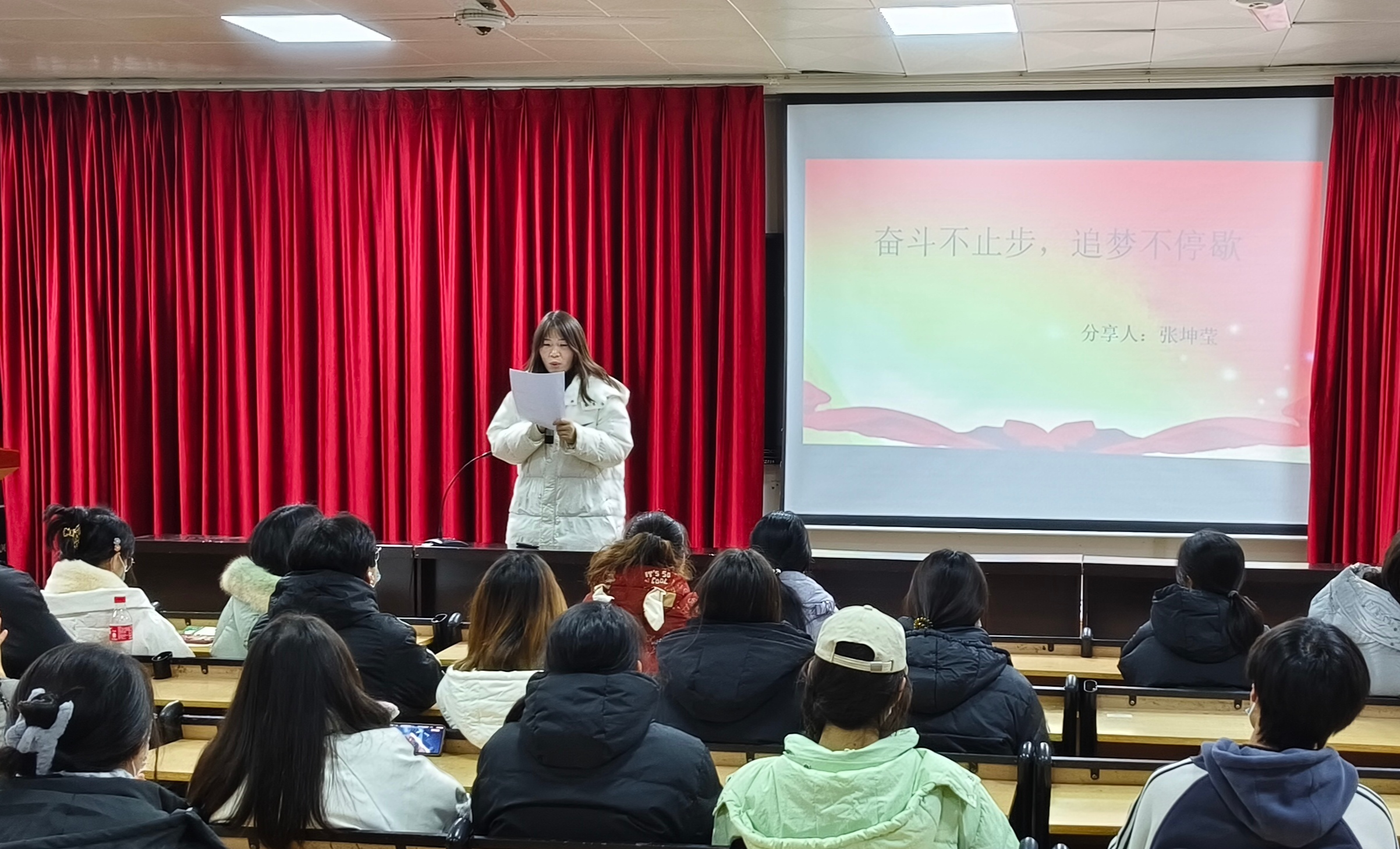 最后,由学工党支部张坤莹同学上台发言。作为国家奖学金获得者,她认为作为一名员工党员,只有以学习为基础,刻苦磨炼技能,才能在日后的工作生活中行稳致远。