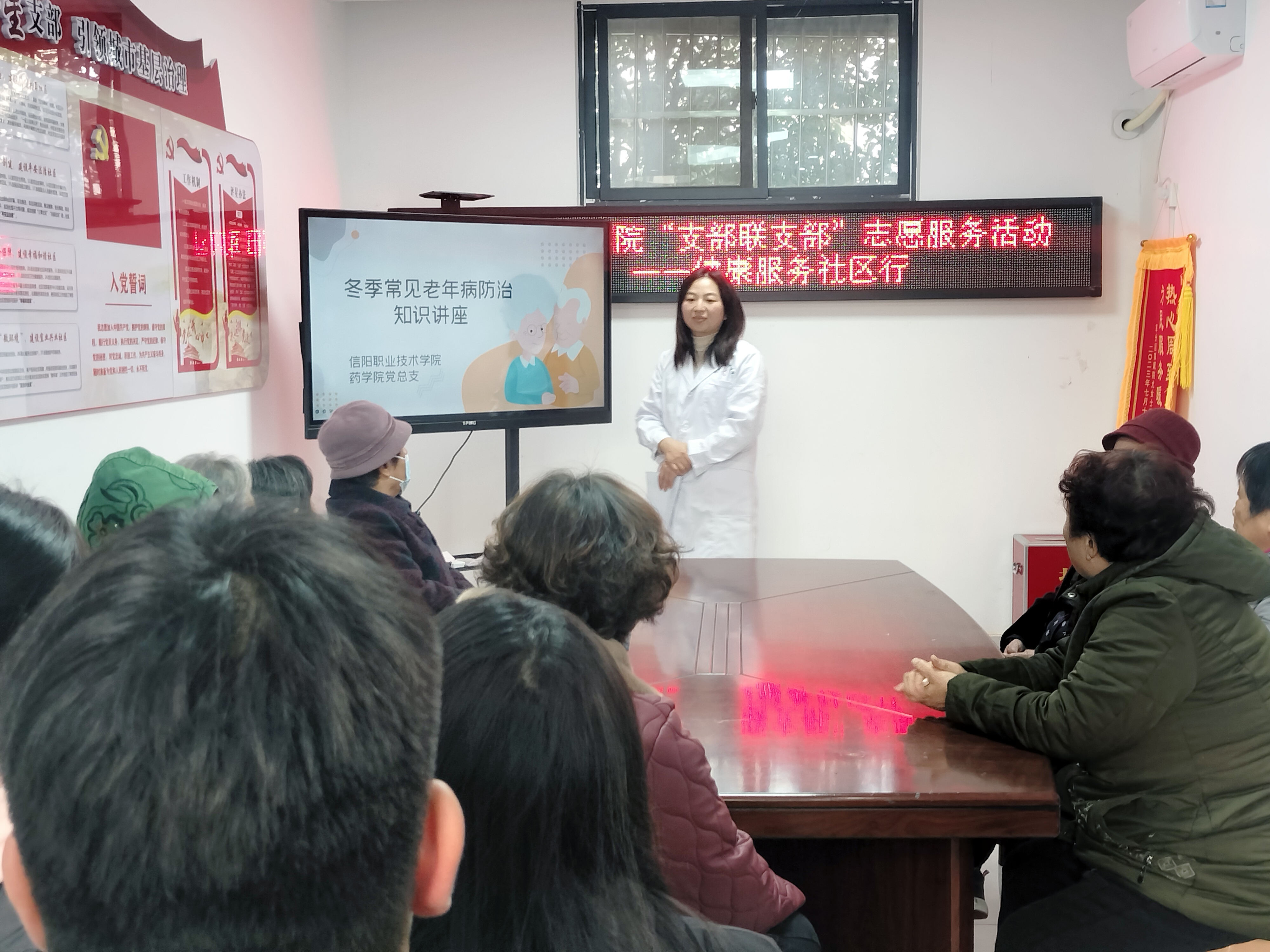 首先,由党员教师夏小婧为老人们进行“冬季常见老年病防治知识”讲座,对老年人常见疾病防治,尤其是用药安全方面进行细致讲解,包括药品的种类、剂量、使用方法、注意事项等,并对老人提出的健康方面问题给予了耐心指导。接着青年志愿者为社区老人免费提供测量血压、发放健康知识宣传页和中药养生花茶等服务,帮助他们了解自己的身体状况,为他们普及健康卫生知识,并叮嘱他们感觉不适要及时就医。社区孙书记说:“希望以后多开展这种健康服务活动,让社区老人能在家门口享受到这么专业的免费医疗服务!”一位89岁老奶奶感慨的说:“高校为我们提供这么暖心的服务,关心我们的健康,我们内心很感动!”